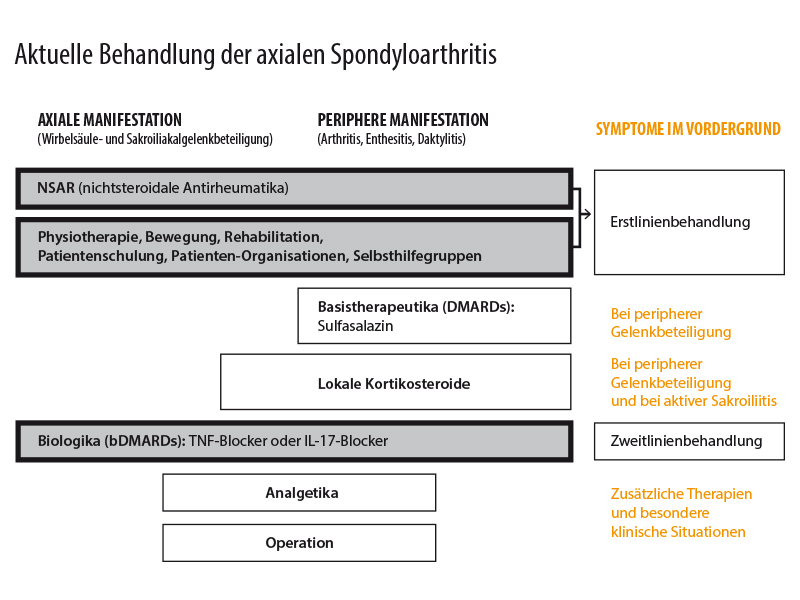 Für die Therapie der axialen Spondyloarthritis existieren die 2019 aktualisierten gemeinsamen Behandlungsempfehlungen des American College for Rheumatology (ACR)/Spondylitis Association of America (SAA)/Spondyloarthritis Research and Treatment Network (SPARTAN) [38] sowie die 2016 überarbeiteten Empfehlungen von Assessment of Spondyloarthritis international Society (ASAS) und European League Against Rheumatism (EULAR) [34]. Die amerikanischen und europäischen Empfehlungen ähneln sich hierbei in den grundlegenden Punkten und beinhalten neben TNF auch den IL-17-Signalweg als Target.